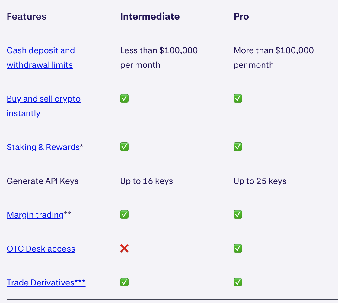 When you are verified with an Intermediate account, you can buy and sell crypto, deposit cash and crypto, margin trade, and much more. The Intermediate level is best for a vast majority of clients.