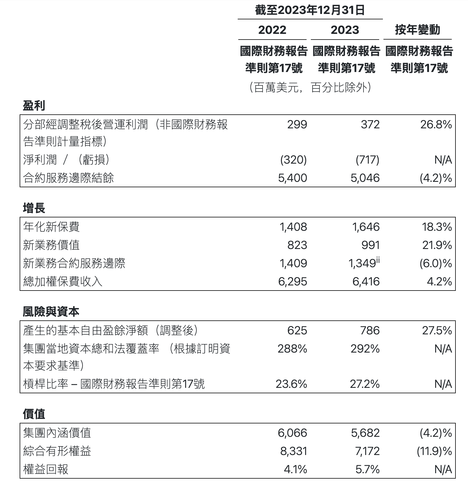 於2024年,我們錄得淨利潤10百萬美元,而本公司權益持有人應佔淨利潤(非國際財務報告會計準則計量指標)為24百萬美元,差額主要是由於將部分FWD Life Malaysia的淨虧損歸屬為非控股權益。
